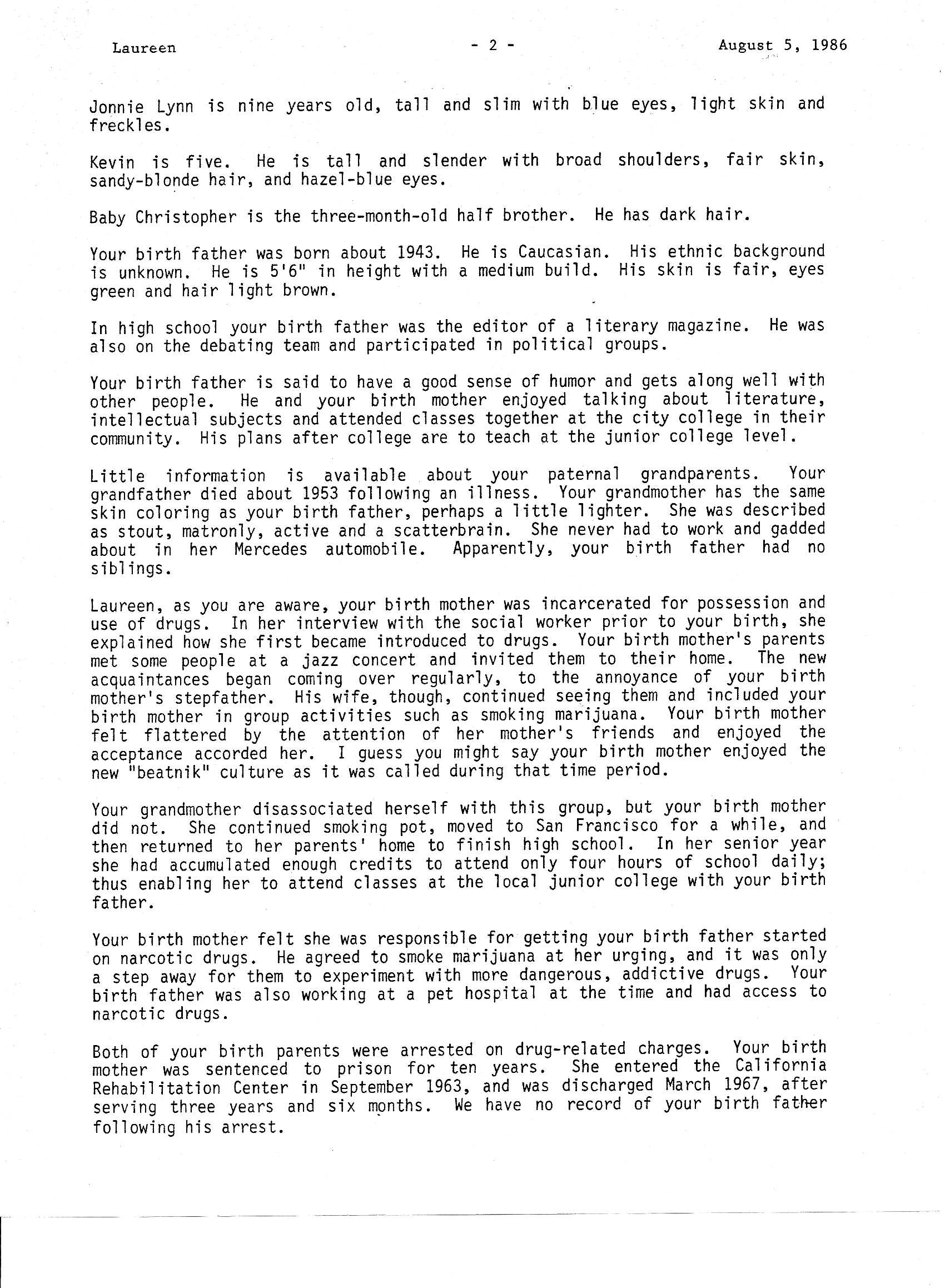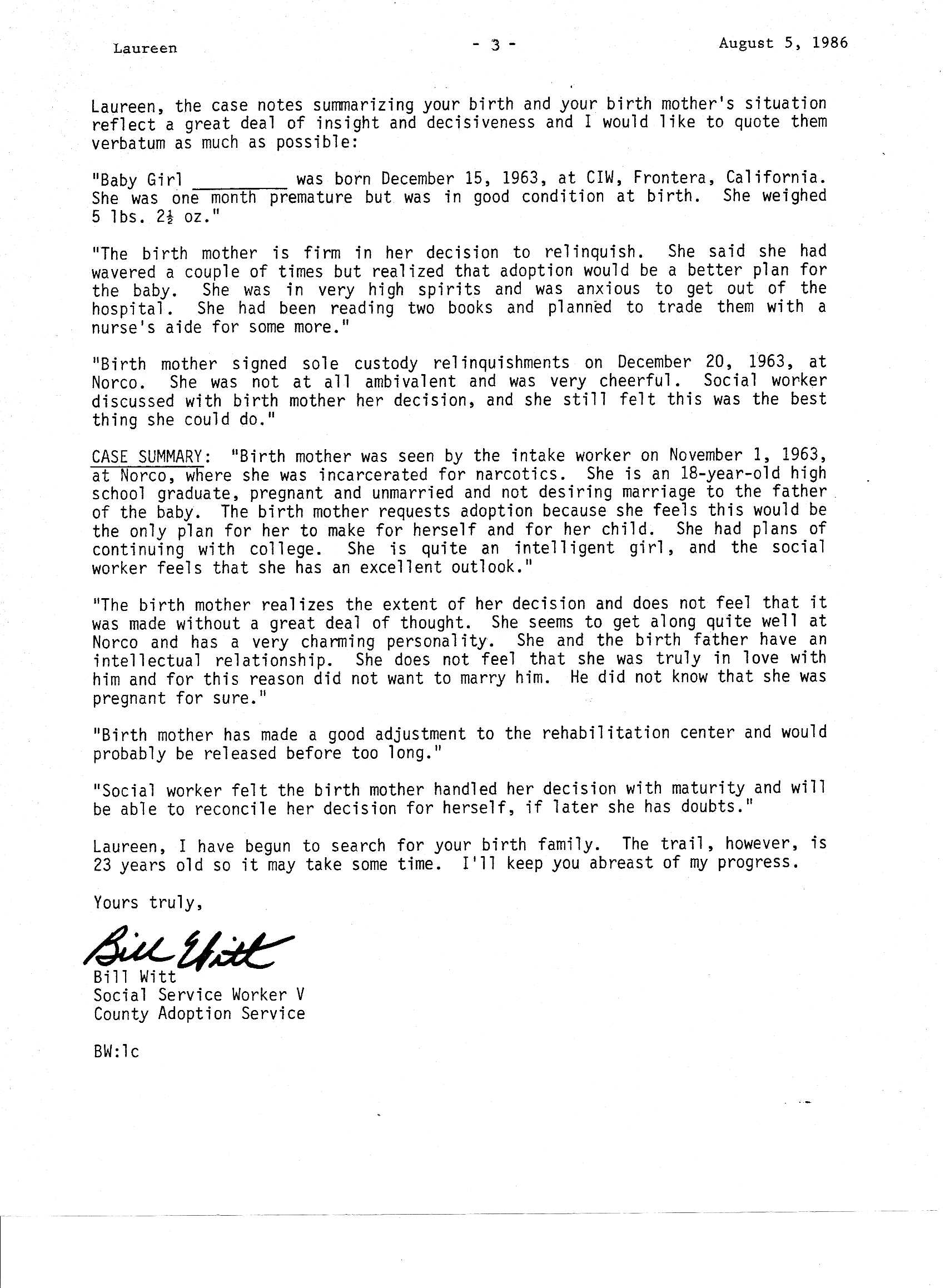 I think Bill Witt went way above and beyond the call of duty in providing the following information to me.  I am grateful that somehow I found him when I did.  I am curious to know about other adoptees (in California or across the country) who have been provided their “non-identifying” information.  Did you receive a story?  Did you receive vivid detail about skin tone, personality, quirks, family members?  Or did you receive some sort of factual outline or listing of non-identifying data? Thank you, Bill Witt, for putting together my story.